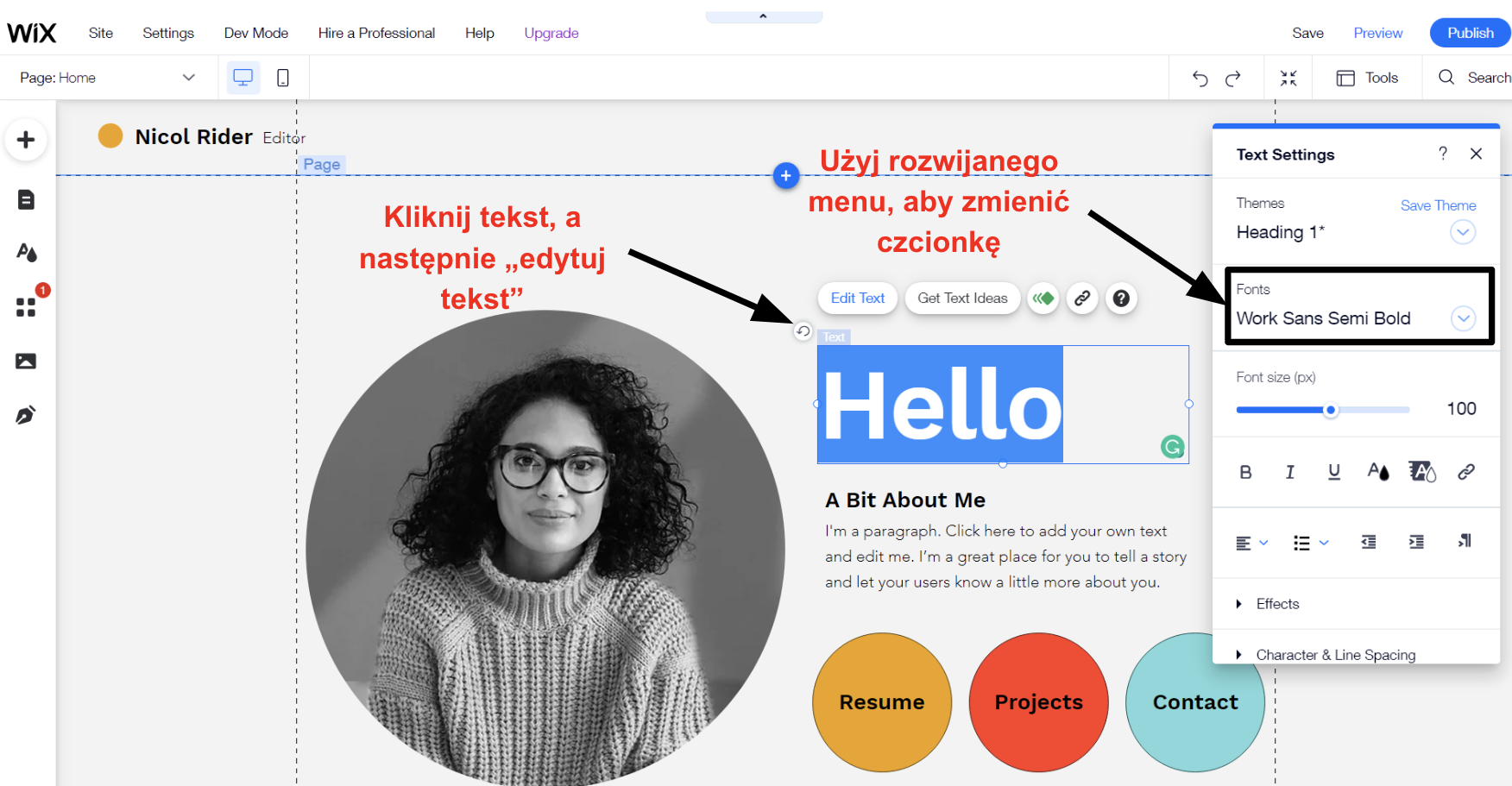 Zmiana czcionek na stronie Wix polega po prostu na kliknięciu tekstu, który chcesz zmienić, i naciśnięciu przycisku Edytuj tekst.Możesz edytować każde pole tekstowe osobno lub użyć opcji Zapisz motyw, aby zastosować zmiany czcionek w całej witrynie. Dzięki Wix możesz wybrać różne czcionki dla różnych typów tekstu – na przykład możesz wybrać jedną czcionkę dla nagłówka 1 i użyć jej jako głównego nagłówka (jak w szablonie, który pokazuję poniżej), i inną czcionkę dla podtytułów. Jeśli chcesz, możesz także mieć inną czcionkę dla stylów akapitów.