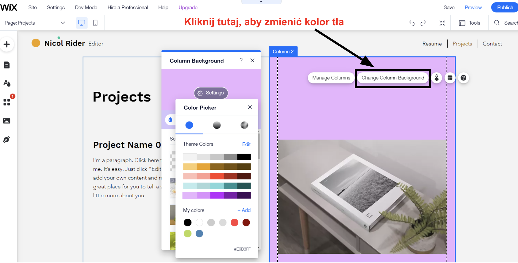 Dzięki Wix możesz łatwo zmienić kolor swoich czcionek w polu ustawień tekstu, ale równie łatwo jest zmienić kolor innych elementów, takich jak tła kolumn. Możesz użyć jednolitego koloru tła za pomocą próbnika kolorów, jak pokazano na zrzucie ekranu poniżej. Wix automatycznie tworzy uzupełniające palety kolorów pasujące do motywu, ale możesz zmienić palety, korzystając z opcji „zmień kolory witryny”. Możesz także dodać własne kolory, aby pasowały do Twojej marki.