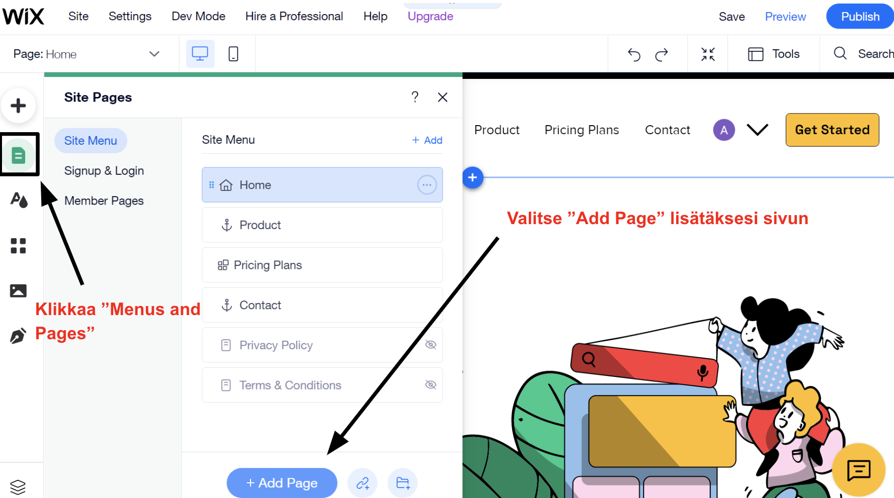 Uuden sivun lisääminen Wixissä ei juuri voisi olla helpompaaKun lisäät sivustolle uusia sivuja, ne ilmestyvät automaattisesti sivuston navigointipalkkiin.