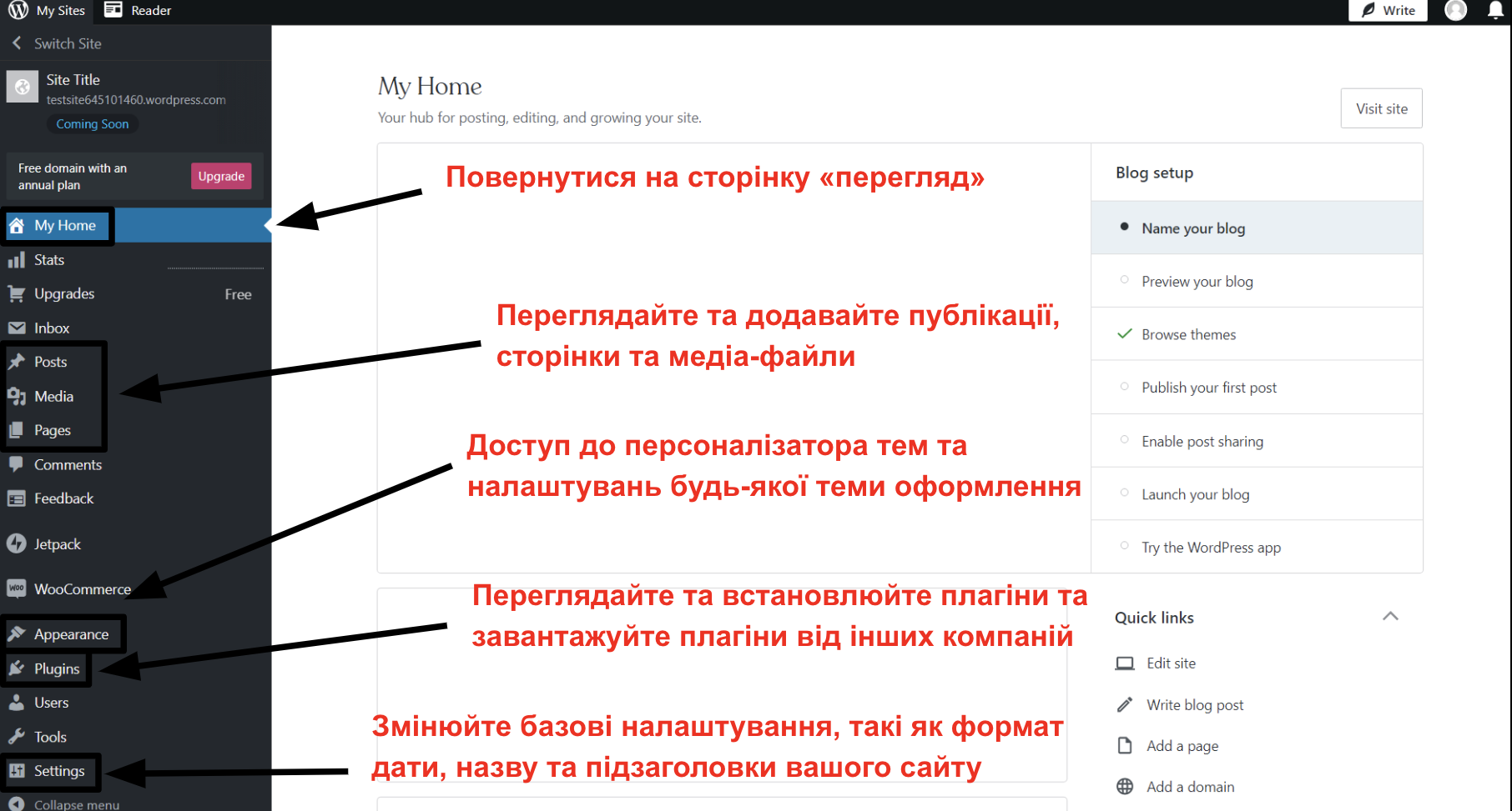 Панель керування WordPress має досить просту навігацію, якщо ви знаєте, де що знаходиться!WordPress використовує «сленг», який відрізняється від термінології інших конструкторів сайтів. Тому, щоб спростити користування ним, ми наводимо короткий опис різних розділів панелі управління WordPress: