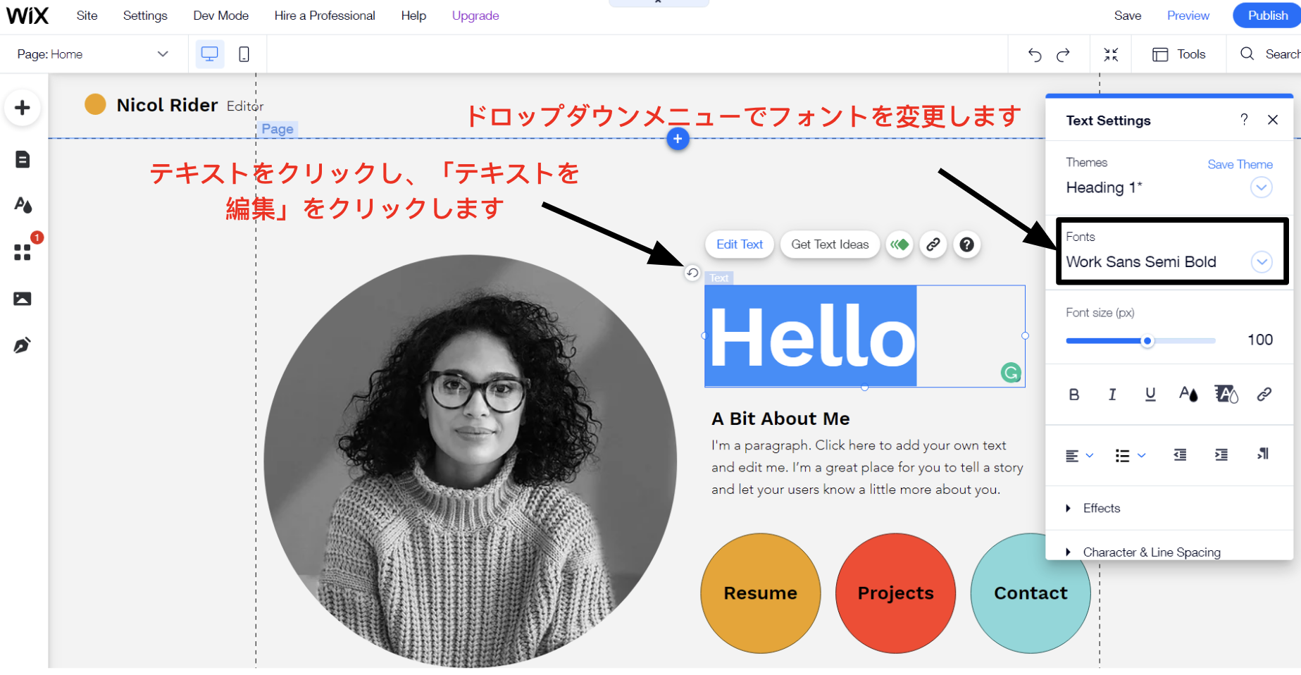 Wixでフォントを変えるには、テキストをクリックして「テキストを編集」ボタンを押します。テキストボックスごとに編集することもできますが、「テーマを保存」をクリックすると、サイト全体にフォントの変更が適用されます。 Wixの場合、テキストの種類ごとにフォントを選べます。例えば、ヘッダー1とサブヘッダーで異なるフォントを使えるのです(下の画像では、メインヘッダーのフォントを編集しています)。段落のスタイルごとに異なるフォントにすることもできます。