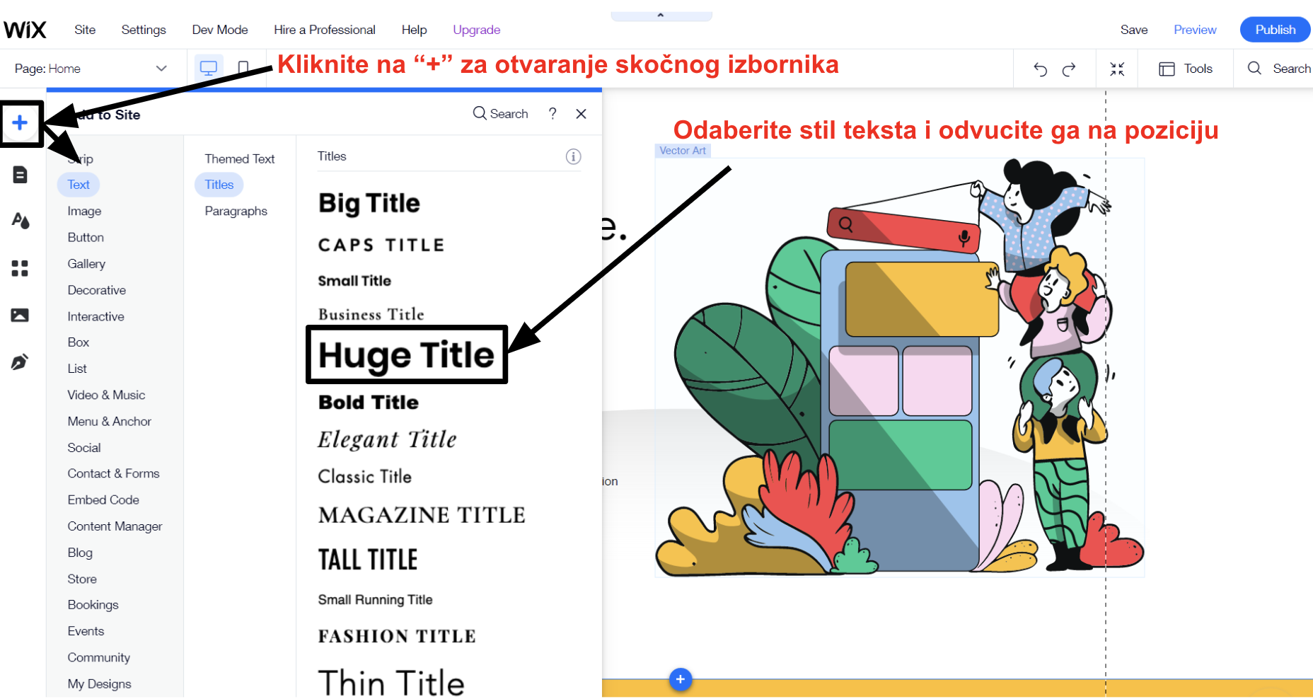 Možete dodati nove odjeljke teksta na svoju web stranicu u samo nekoliko klikova. U Wixu koristite alat Dodaj na alatnoj traci slijeva, a zatim na skočnom izborniku odaberite Tekst.