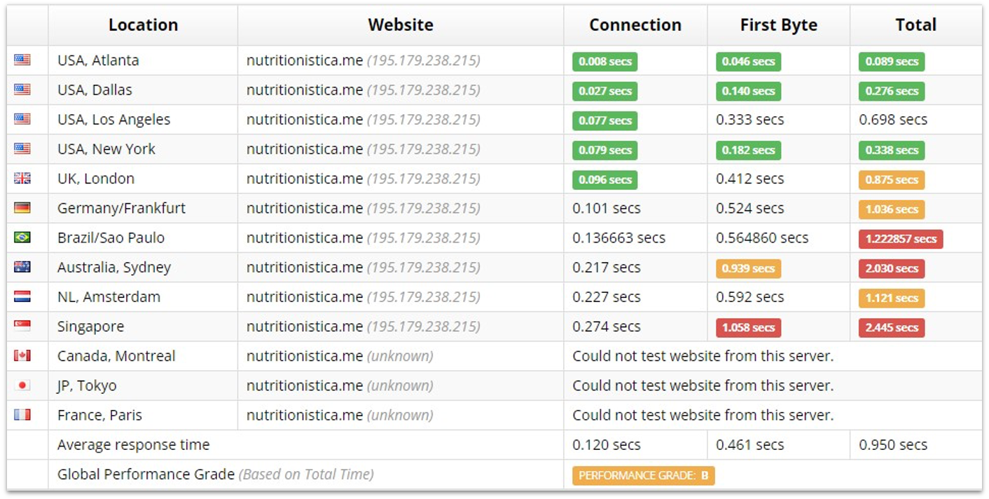 The results for Time to First Byte – the amount of time it takes for the server to start sending website data – were typically around 0.2s. This is a very good speed – it isn’t unusual to see this number at 0.5s or higher from shared hosting services.