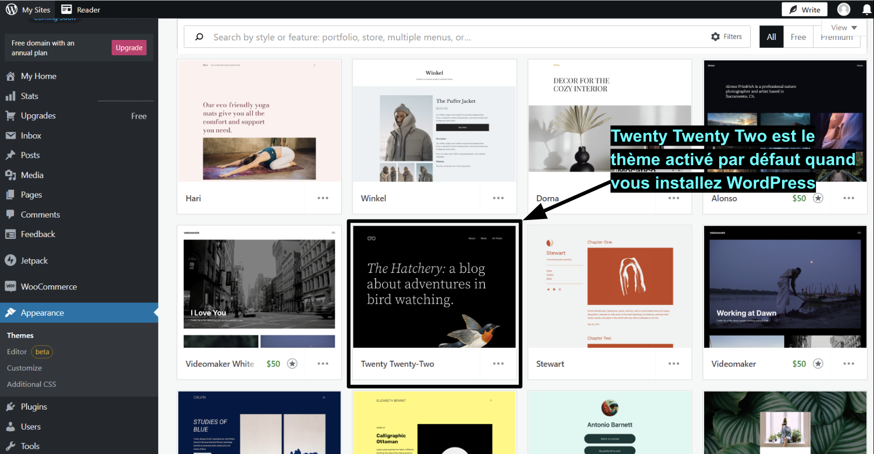Cherchez, installez et activez des thèmes gratuits dans le catalogue WordPressEn plus des thèmes gratuits disponibles sur le catalogue WordPress, vous pouvez acheter des thèmes premium venant de tiers comme TemplateMonster ou ThemeForest.