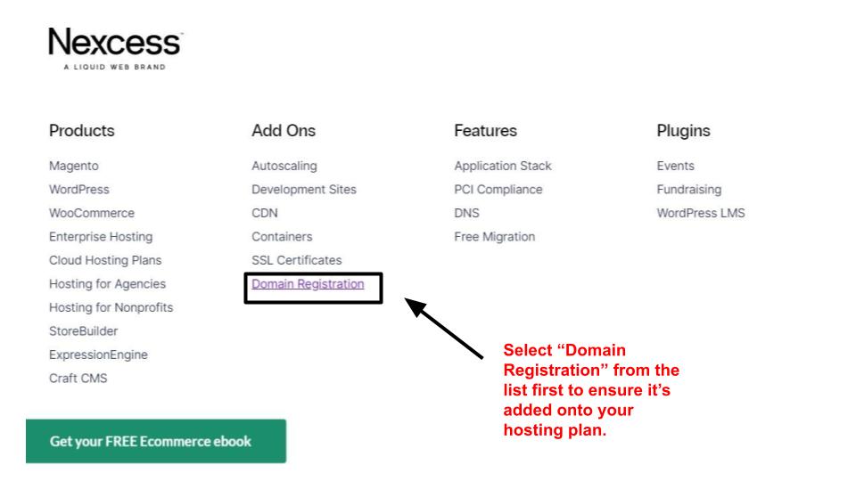 Be sure to add a domain name first to start off your Nexcess hosting plan purchase.