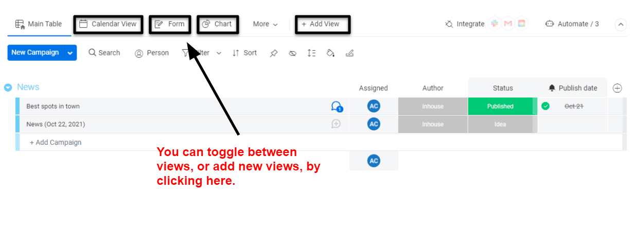 Forms view: Allows you to convert your boards into forms, send them to your contacts, and convert the information received into new items