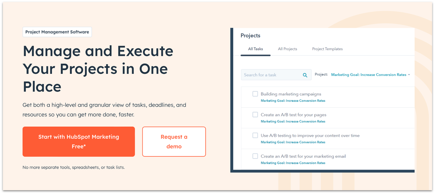 HubSpot packages its powerful and easy-to-use CRM with plenty of other tools that you can use to enhance productivity and manage projects. It offers tailored plans for a number of marketing and sales-oriented firms, though its integration of project management features is best suited to teams in these fields. If you’re looking for straightforward project management software, you may want to check out our list of the best project management software in 2024.