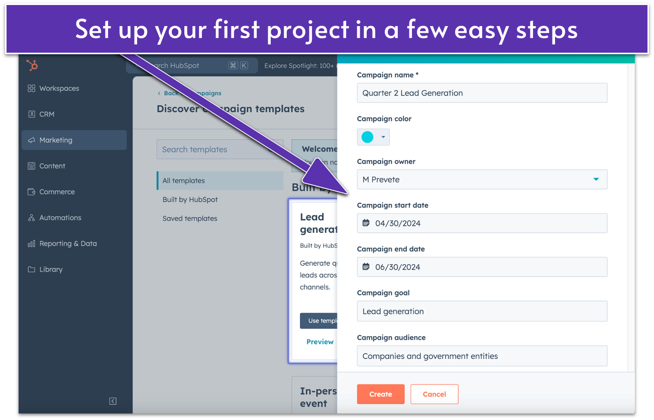 You can use HubSpot’s CRM and project management software to oversee sales team pipelines, manage marketing campaigns, and create and track content management performance.